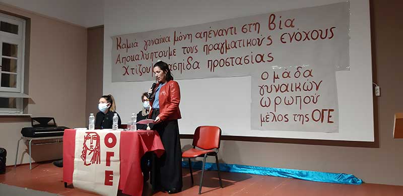 Κλείνοντας, ανέφερε ότι η ΟΓΕ αποκαλύπτει το πραγματικό πρόσωπο της βίας των εκμεταλλευτών μας που τσακίζει τις ζωές μας. Παίρνει αγωνιστικές πρωτοβουλίες δυναμώνοντας τον συλλογικό αγώνα για να διεκδικήσουμε τη ζωή που έχουμε ανάγκη σήμερα, τον 21ο αιώνα, και τις κοινωνικές προϋποθέσεις που θα μας εξασφαλίζουν όχι μόνο αξιοπρεπή ζωή με δικαιώματα, αλλά και ισότιμες σχέσεις συντροφικότητας. Οι Σύλλογοι και οι Ομάδες Γυναικών της ΟΓΕ μπορούν να γίνουν κυψέλες οργάνωσης και αλληλεγγύης, ώστε να αντλήσει η γυναίκα του μόχθου τη δύναμη, το κουράγιο, την αντοχή να αλλάξει τη ζωή της μαχόμενη.