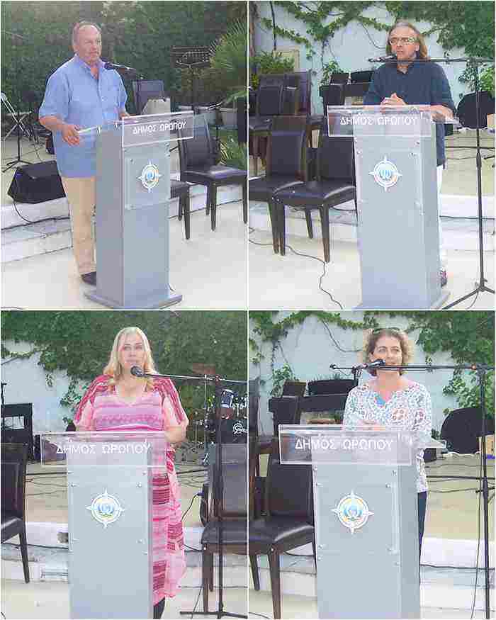 Στην εκδήλωση παρευρέθηκαν επίσης ο Αντιπρόεδρος της Κ.Ε.Δ.Ω. κ. Νίκος Μαντάς, η Πρόεδρος της Σχολικής Επιτροπής Παιδείας κ. Ανδριάνα Αλεξανδράτου, η Πρόεδρος Επιτροπής Τουριστικής Ανάπτυξης Ωρωπού κ. Αναστασία Μαραβέλια, η Δημοτική Σύμβουλος κ. Δήμητρα Τοτόμη-Σωτήρχου, οι Πρόεδροι των Τ.Κ. Νέων Παλατίων κ. Αντώνης Καζαμίας και Χωριού Ωρωπός κ. Λάμπρος Ρόδης, ο Επικεφαλής της «Δυναμικής Πολιτείας» κ. Γιώργος Γιασημάκης, ο Πρόεδρος της ΟΝΝΕΔ Ωρωπού, κ. Παναγιώτης Μιχαλόπουλος, καθώς επίσης Πρόεδροι και Μέλη Πολιτιστικών Συλλόγων και Φορέων της Περιοχής.