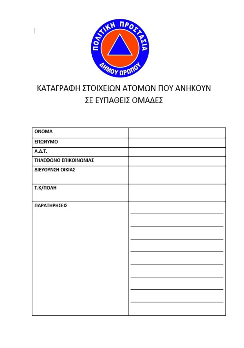 Ο Δήμος Ωρωπού, εφαρμόζοντας τις κατευθυντήριες οδηγίες της Γ.Γ. Πολιτικής Προστασίας για την οργανωμένη προληπτική απομάκρυνση πολιτών, για λόγους προστασίας από εξελισσόμενη ή επικείμενη καταστροφή εξαιτίας δασικών πυρκαγιών, και τις οδηγίες για τη σύνταξη ειδικών σχεδίων, στα πλαίσια εφαρμογής του αριθμ. 23 παρ. 4 του Ν. 4662/2020, προχωρά στη δημιουργία ειδικού Μητρώου Πολιτικής Προστασίας ατόμων που ανήκουν σε ευπαθείς ομάδες πληθυσμού (πχ. άτομα με κινητικά προβλήματα, τυφλοί, κωφοί, ασθενείς που μπορούν να μετακινηθούν μόνο με ασθενοφόρο κλπ.) και στερούνται προστατευτικού περιβάλλοντος.