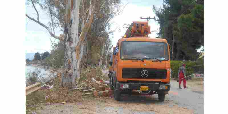 Από το πρωί συνεργείο του Δήμου κόβει τους πανύψηλους ευκαλύπτους, ώστε να δυναμώσουν αλλά και να μην παρεμποδίζουν την ομαλή διέλευση των μεγάλων, κυρίως, οχημάτων, καθώς, μείωναν την οπτική των οδηγών σε μια επικίνδυνη στροφή πριν την ανηφόρα προς την Εφέδρων.