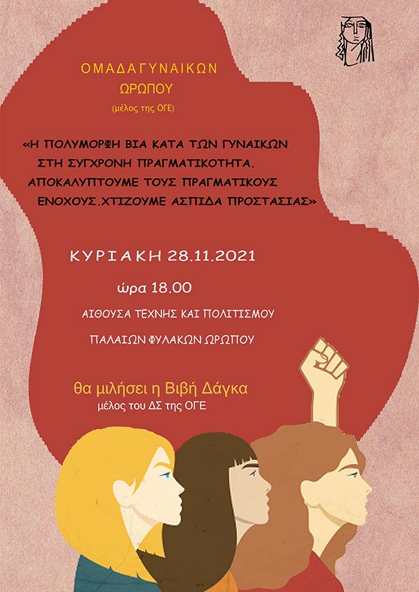 Η Ομάδα Γυναικών Ωρωπού (μέλος της ΟΓΕ), σας προσκαλεί στην εκδήλωση που διοργανώνει την ΚΥΡΙΑΚΗ 28/11/2021 ώρα 18.00 στην αίθουσα Τέχνης και Πολιτισμού στο χώρο Παλαιών Φυλακών Ωρωπού, με θέμα : « Η πολύμορφη βία κατά των γυναικών στη σύγχρονη πραγματικότητα. Αποκαλύπτουμε τους πραγματικούς ενόχους. Χτίζουμε ασπίδα προστασίας».