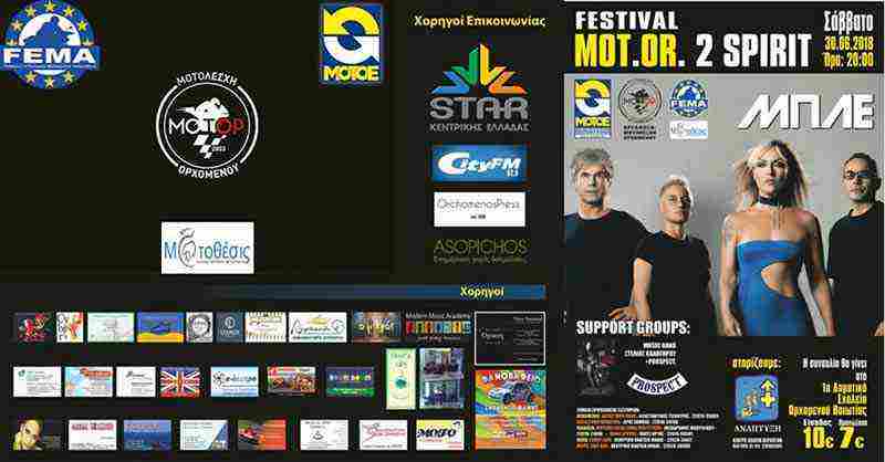 Η ΜΟΤΟΛΕΣΧΗ ΟΡΧΟΜΕΝΟΥ διοργανώνει στις 30 Ιουνίου 2018 το 2ο  Φεστιβάλ, MOT.OR 2 SPIRIT, στο 1ο Δημοτικό Σχολείο Ορχομενού Βοιωτίας, με την συναυλία των ΜΠΛΕ. Ώρα προσέλευσης 20.00 μ.μ.