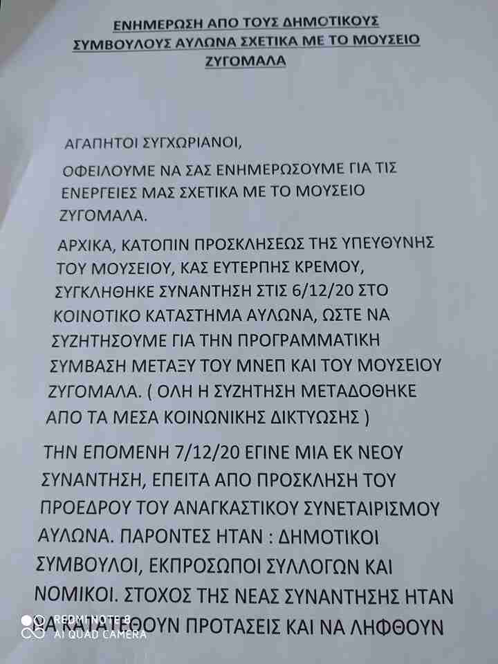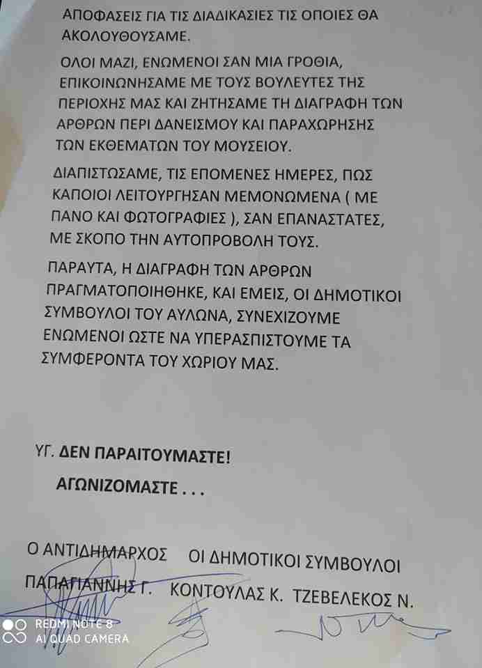 Με κοινή ανακοίνωσή τους, την οποία υπογράφουν ο Αντιδήμαρχος κ. Γ. Παπαγιάννης και οι Δημοτικοί Σύμβουλοι κ. Ν. Τζεβελέκος και Κ. Κοντούλας, αναφέρονται στα γεγονότα της 6ης Δεκεμβρίου, όπου έγινε ενδελεχής ενημέρωση  από την υπεύθυνη του Μουσείου και διευθύντρια του Δημοτικού Σχολείου Αυλώνα κα Ε. Κρέμου  και της 7ης Δεκεμβρίου, όπου πραγματοποιήθηκε η συνάντηση-ενημέρωση από τον Αναγκαστικό Συνεταιρισμό Αυλώνα, τονίζουν ότι άμεσα κινητοποιήθηκαν και είχαν θετικά αποτελέσματα. Κατόρθωσαν να αποτρέψουν την ψήφιση των επίμαχων άρθρων στη Βουλή που αφορούσαν στο δανεισμό και στην παραχώρηση των αντικειμένων του Μουσείου. τα οποία κατάφεραν να αποσυρθούν.