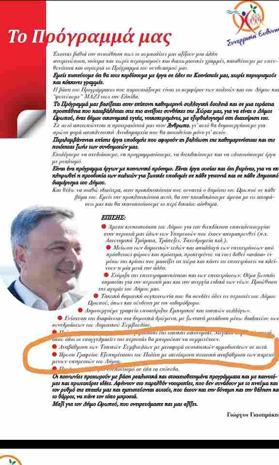 Να θυμίσουμε λοιπόν τι έλεγε ο κ. Γ. Γιασημάκης ως υποψήφιος, τότε, Δήμαρχος «ΟΛΩΝ των Ωρωπίων» στο προεκλογικό του φυλλάδιο αλλά και στην κεντρική ομιλία του, για την ενίσχυση των αρμοδιοτήτων των Τοπικών Συμβουλίων, προφανώς για να δείξει το δημοκρατικό του πρόσωπο προς τους πολίτες όταν ζητούσε την ψήφο τους.