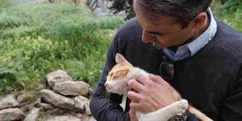 Ο πρωθυπουργός αγκαλιάζει μία αδέσποτη γάτα στο Μυστρά
