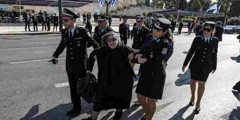 «Οι παρελάσεις είναι υποκρισία», καθώς «μας κυβερνούν οι Γερμανοί» άρχισε να φωνάζει με τους αστυνομικούς να την παίρνουν σηκωτή.