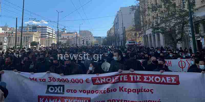 Και λίγο πριν από τις 13:00, όταν και ήταν προγραμματισμένο το πανεκπαιδευτικό συλλαλητήριο, οι φοιτητές… «βγήκαν» από τους γύρω δρόμους, η Πανεπιστημίου γέμισε κόσμο, πολύ κόσμο, παρά την απαγόρευση συναθροίσεων άνω των 100. Οι φοιτητές κάνουν πορεία στη Βουλή.