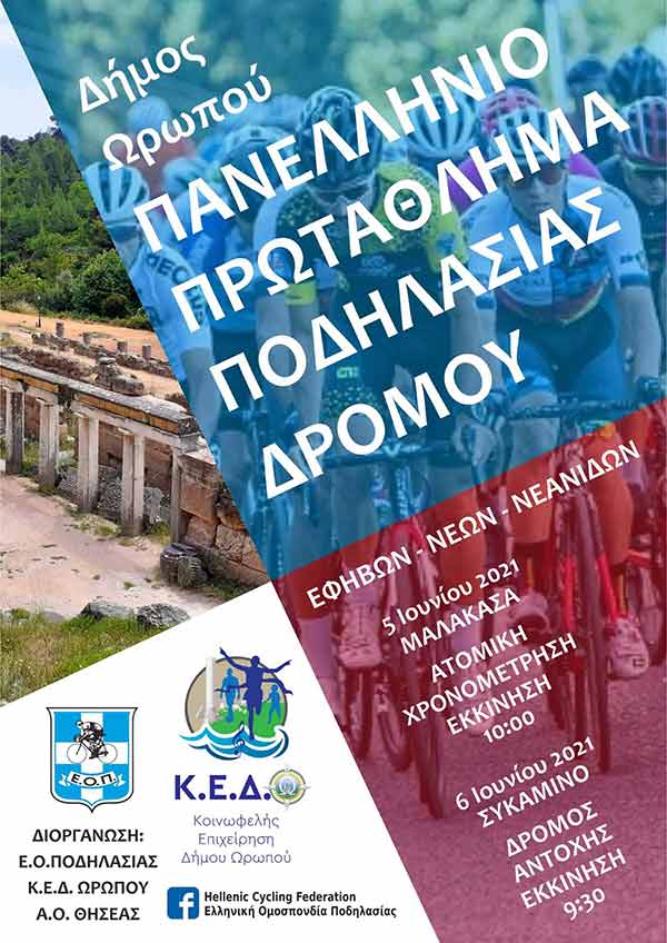 Η Ελληνική Ομοσπονδία Ποδηλασίας στις 5-6 Ιουνίου 2021 διοργανώνει στο Δήμο Ωρωπού την πρώτη διοργάνωση της σε επίπεδο Πανελληνίων Πρωταθλημάτων με το Πρωτάθλημα Δρόμου Νέων Ανδρών-Εφήβων-Νεανίδων 2021, μετά από την 8μηνη και πλέον διακοπή λόγω της πανδημίας.