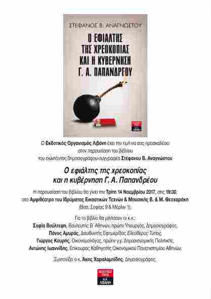 Το βιβλίο του αείμνηστου δημοσιογράφου-συγγραφέα Στέφανου Β. Αναγνώστου με τίτλο «Ο εφιάλτης της χρεοκοπίας και ο Γ. Α. Παπανδρέου», εκδόσεις Λιβάνη, που έφυγε πρόωρα από κοντά μας, παρουσιάζεται, σήμερα, Τρίτη 14 Νοεμβρίου στο Αμφιθέατρο του Ιδρύματος Εικαστικών Τεχνών και Μουσικής Β & Μ. Θεοχαράκη ( Βασ. Σοφίας 9 & Μέρλιν 1).