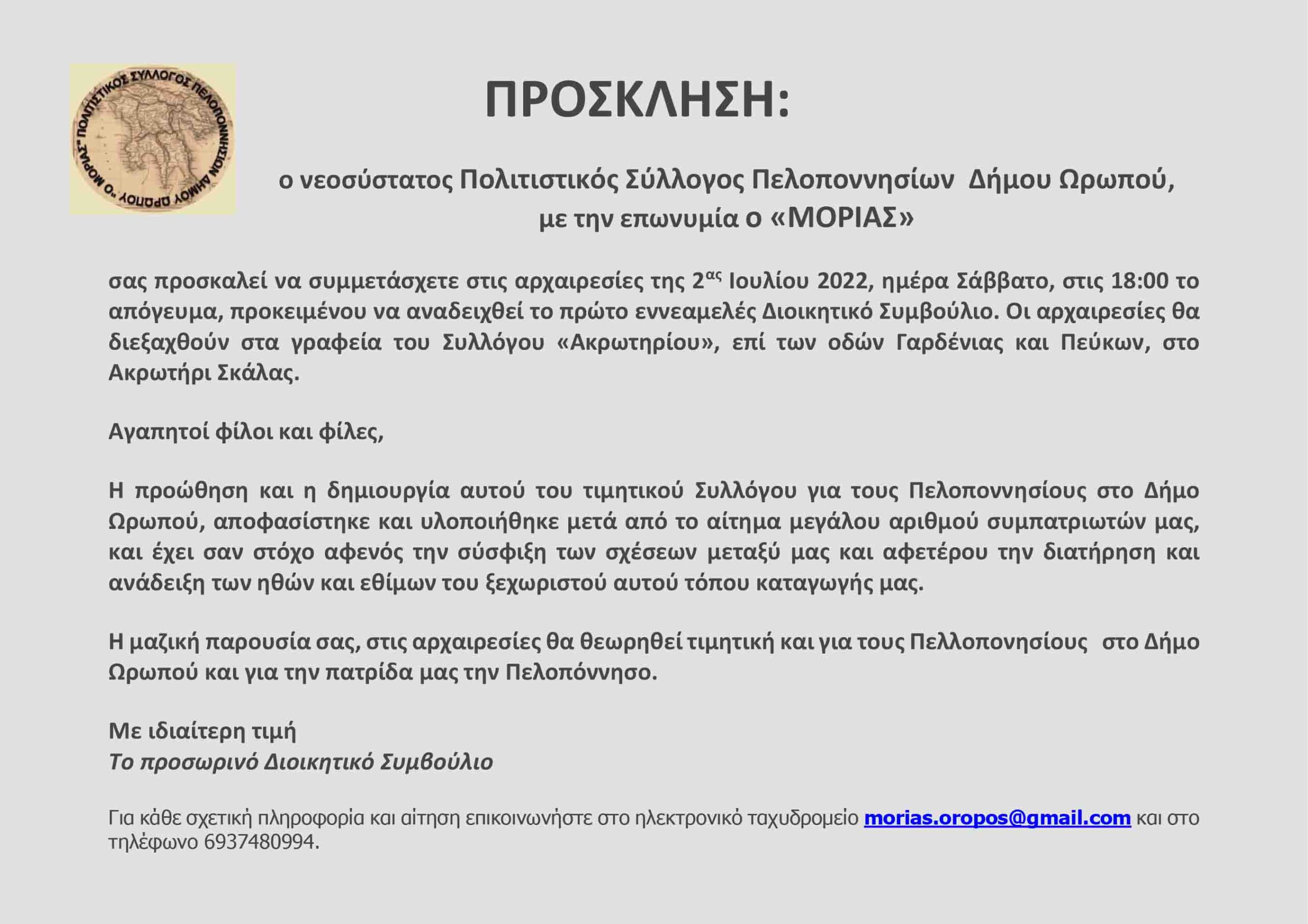 ΠΡΟΣΚΛΗΣΗ: του νεοσύστατου Πολιτιστικού Συλλόγου Πελοποννησίων Δήμου Ωρωπού