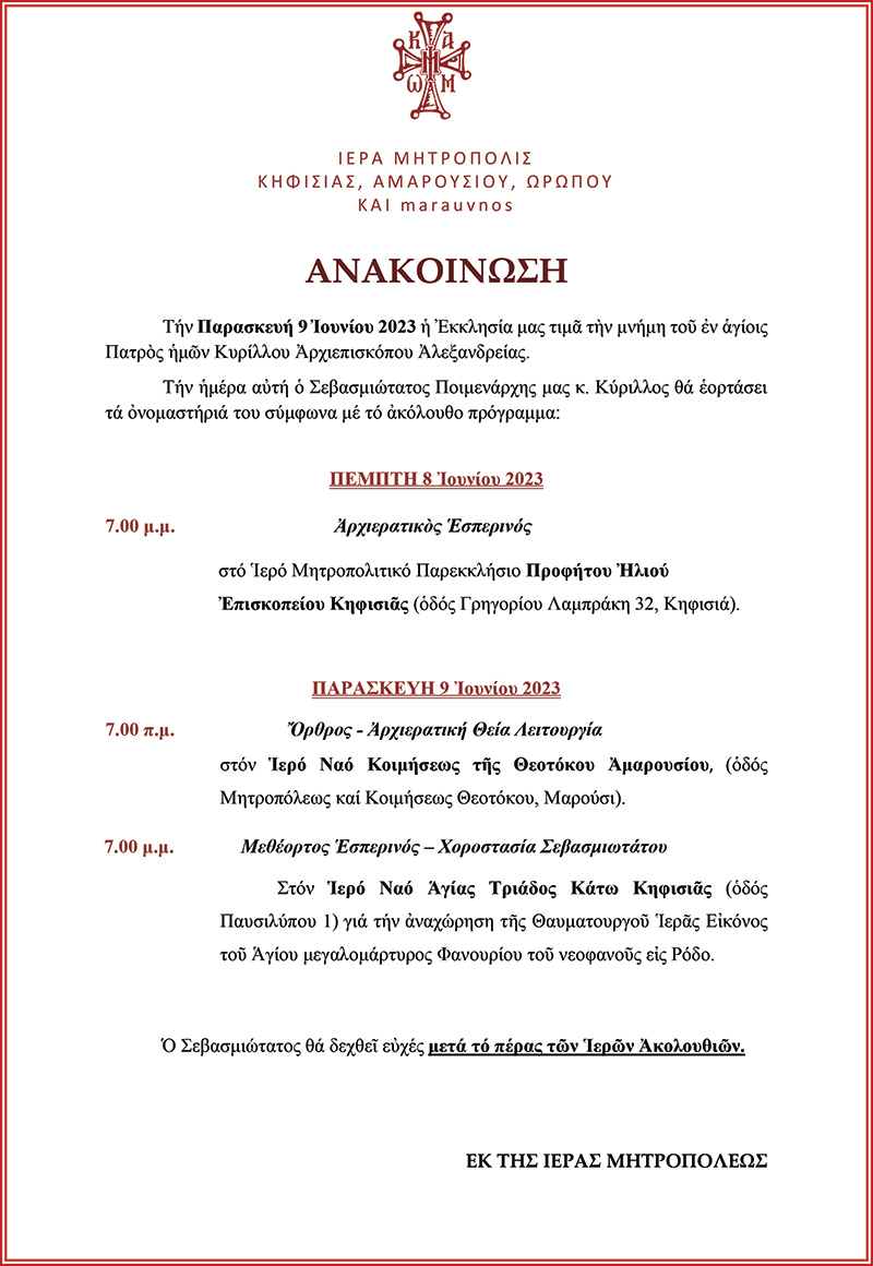 ΑττικήςΡοή ΝέωνΤελευταία Νέα Πρόγραμμα εορτασμού των ονομαστηρίων του Σεβασμιώτατου Ποιμενάρχη μας κ. Κύριλλου Σοφία Μπασκάκη 1 Ιουνίου, 2023