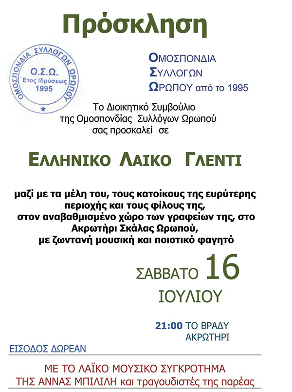 Ροή ΝέωνΤελευταία ΝέαΩρωπός Πρόσκληση στην καλοκαιρινή εκδήλωση της Ομοσπονδίας Συλλόγων Ωρωπού Σοφία Μπασκάκη 10 Ιουλίου, 2022