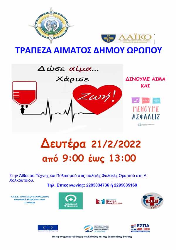 Την Δευτέρα 21 Φεβρουαρίου 2022 από τις 09:00 έως τις 13:00 στην αίθουσα Τέχνης και Πολιτισμού στις Παλαιές Φυλακές Ωρωπού πολίτες που θέλουν να δώσουν αίμα μπορούν να προσέλθουν και να προσφέρουν το πιο πολύτιμο αγαθό που τόσο έχει ανάγκη η κοινωνία μας.