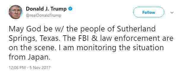 Στο πρώτο του Τweet επισήμανε πως από εκεί παρακολουθεί στενά την κατάσταση. Παράλληλα ανακοίνωσε πως το FBI είναι επί ποδός και βρίσκεται στην περιοχή. Ο Ντόναλντ Τραμπ στο μήνυμά του ξεκινάει με την ευχή «ο Θεός να προστατεύσει τους ανθρώπους που βρίσκονται εκεί».
