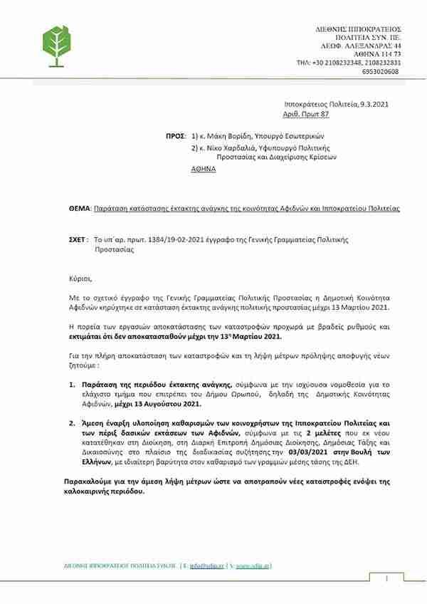 - Την παράταση της περιόδου έκτακτης ανάγκης, σύμφωνα με την ισχύουσα νομοθεσία για το ελάχιστο τμήμα που επιτρέπει του Δήμου Ωρωπού, δηλαδή της Δημοτικής Κοινότητας Αφιδνών, μέχρι 13 Αυγούστου 2021.