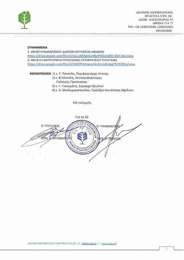 Ευελπιστούμε ότι, η Περιφέρεια Αττικής, ο Δήμος Ωρωπού και η Δημοτική Κοινότητα Αφιδνών που κοινοποιηθηκε το έγγραφο θα εκφράσουν έγκαιρα τη σύμφωνη γνώμη τους, ώστε να γίνουν αποδεκτά τα αιτήματα για να υλοποιηθούν και να ολοκληρωθούν οι αναγκαίες εργασίες πρόληψης και να αποτραπούν νέες καταστροφές ενόψει της καλοκαιρινής περιόδου.