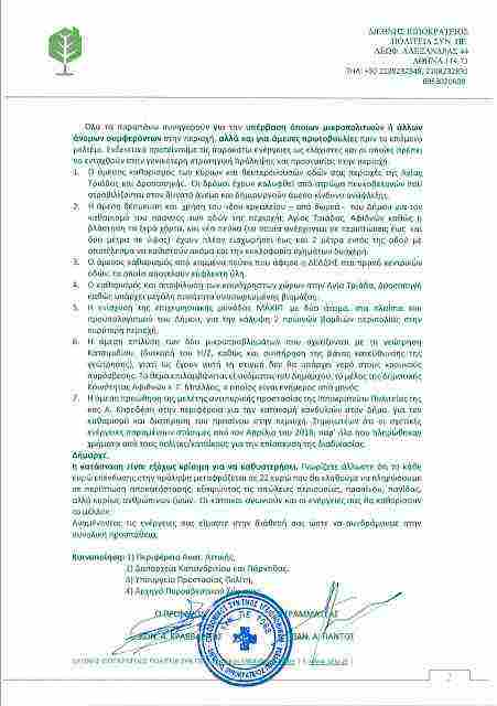 - Ο άμεσος καθαρισμός των κύριων και δευτερευουσών οδών στις περιοχές της Αγίας Τριάδας και Δροσοπηγής. Οι δρόμοι έχουν καλυφθεί από στρώμα πευκοβελονών που στροβιλίζονται στον δυνατό άνεμο και δημιουργούν άμεσο κίνδυνο ανάφλεξης.