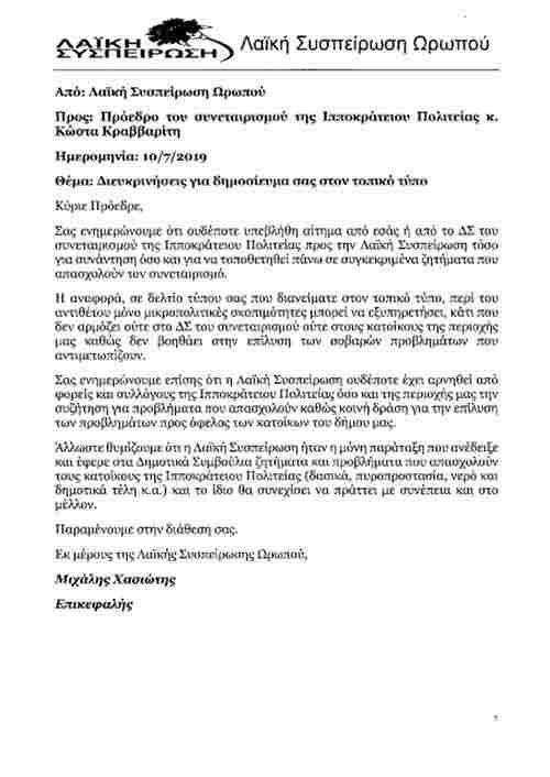 Ο επικεφαλής του συνδυασμού Λαικη Συσπείρωση Ωρωπού κ. Μιχάλης Χασιώτης μετεκλογικά με επιστολή του  προς τον Πρόεδρο του ΔΣ ΣΔΙΠ διαμαρτυρηθηκε πλην όμως δεν απάντησε  στα δύο ερωτήματα…