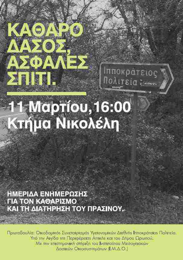 Σε αυτά τα πλαίσια ο Συνεταιρισμός της «Ιπποκράτειου Πολιτείας», αναλαμβάνει πρωτοβουλία ενημέρωσης των κατοίκων και των πολιτών όλου του δήμου για την προστασία και τον καθαρισμό του Δάσους και οργανώνει ημερίδα ενημέρωσης την Κυριακή 11 Μαρτίου στις 4.00 το απόγευμα, στο κτήμα Νικολέλη. Θα μιλήσουν διακεκριμένοι επιστήμονες ερευνητές και ακαδημαϊκοί με συντονιστή τον γείτονά μας, καθηγητή Ανδρέα Θεοδωρακόπουλο. Η εσπερίδα θα ολοκληρωθεί με ανοιχτή συζήτηση, ενώ ο καφές και τα γλυκά είναι κερασμένα! Χαιρετισμό θα απευθύνουν εκπρόσωποι της Τοπικής Αυτοδιοίκησης.