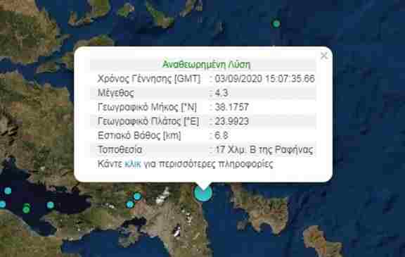 Ισχυρός σεισμός έγινε στις 18.07 αισθητός στην Αττική. Ο σεισμός είχε ένταση 4,3 ρίχτερ και σύμφωνα με το Γεωδυναμικό Ινστιτούτο το επίκεντρό του ήταν κοντά στην Ραφήνα και πιο συγκεκριμένα ανάμεσα σε Ραφήνα και Μαραθώνα.