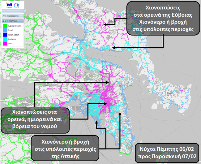 Συγκεκριμένα, στην Αττική θα εκδηλωθούν χιονοπτώσεις κατά περιόδους στα ορεινά και ημιορεινά του νομού και σε περιοχές στα βόρεια του λεκανοπεδίου έως το πρωί της Παρασκευής 07/02. Βροχή ή χιονόνερο αναμένεται στις υπόλοιπες περιοχές. Οι άνεμοι θα πνέουν από βορειοδυτικές διευθύνσεις 3 έως 5 μποφόρ με μικρή εξασθένηση από το μεσημέρι. Η θερμοκρασία στο κέντρο των Αθηνών θα κυμανθεί από 2 έως 8 βαθμούς. Στη Θεσσαλονίκη αναμένεται ηλιοφάνεια με αραιές μόνο νεφώσεις κατά περιόδους. Οι άνεμοι θα πνέουν από βορειοδυτικές διευθύνσεις 3 έως 5 και στα δυτικά του νομού πρόσκαιρα έως 6 μποφόρ. Η θερμοκρασία στο κέντρο της πόλης θα κυμανθεί από -1 έως 7 βαθμούς.