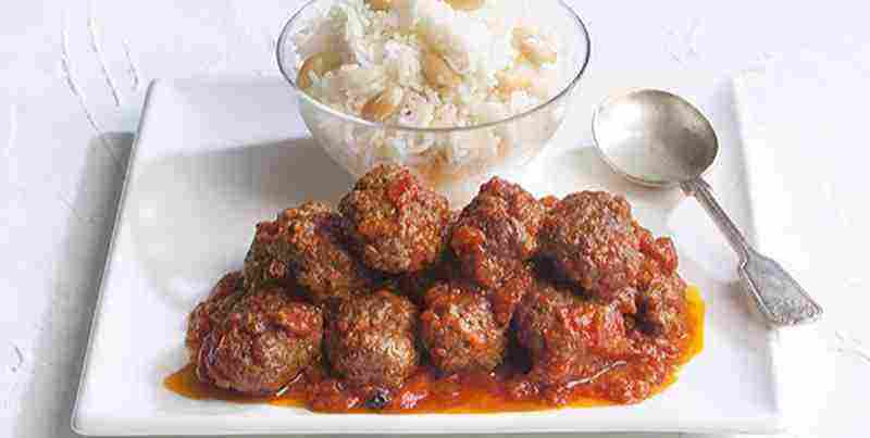 Σερβίρουμε σε μια μεγάλη ωραία πιατέλα το ρύζι, με τα σουτζουκάκια και τη σάλτσα από πάνω.