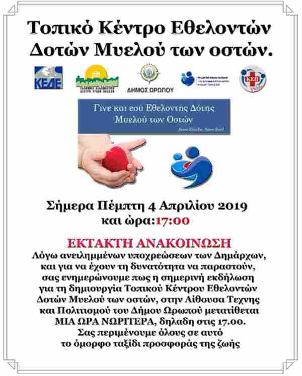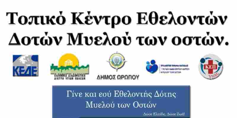 Ροή ΝέωνΤελευταία ΝέαΩρωπός Στις 17.00 μ.μ. σήμερα η εκδήλωση για τη δημιουργία Τοπικού Κέντρου Εθελοντών Δοτών Μυελού των οστών στις Φυλακές Ωρωπού Σοφία Μπασκάκη 4 Απριλίου, 2019
