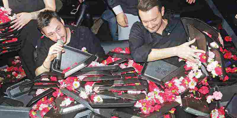 Μόλις του έδωσε το μικρόφωνο ο συνάδελφός του τα γαρίφαλα έπεσαν βροχή, με αποτέλεσμα να καλύψουν τους καλλιτέχνες σχεδόν έως τον λαιμό.