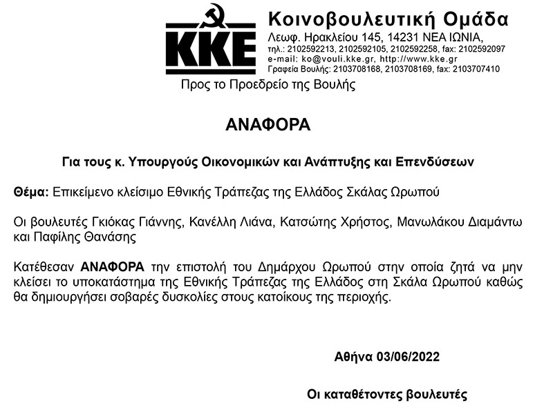Το ΚΚΕ φέρνει στη Βουλή το κλείσιμο της Εθνικής Τράπεζας στη Σκάλα Ωρωπού