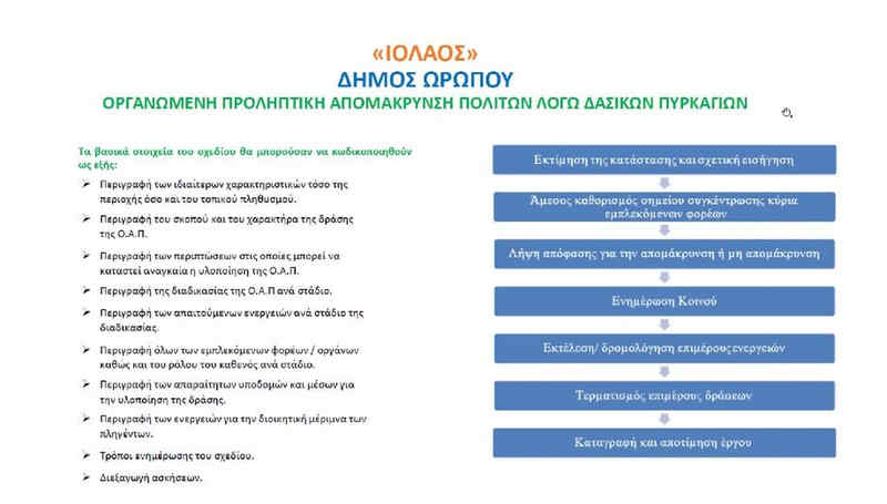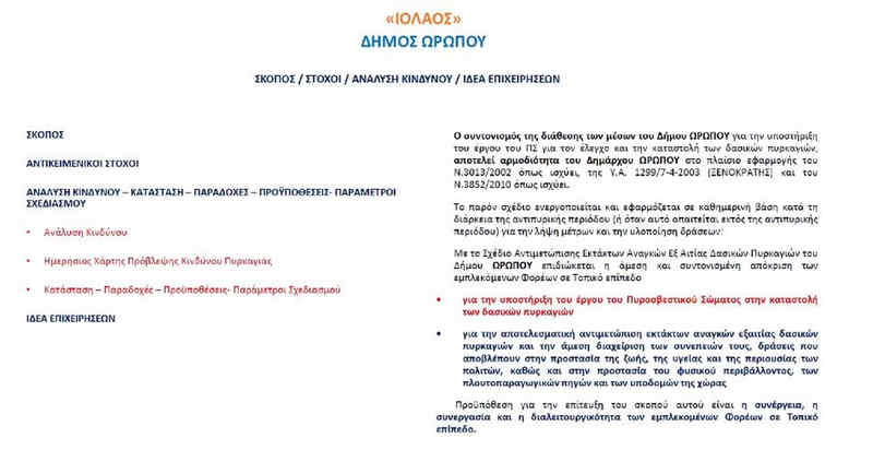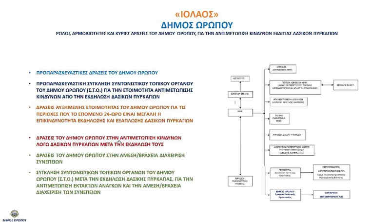 Με το Σχέδιο Αντιμετώπισης Εκτάκτων Αναγκών Εξ Αιτίας Δασικών Πυρκαγιών του Δήμου Ωρωπού επιδιώκεται η άμεση και συντονισμένη απόκριση των εμπλεκόμενων φορέων σε τοπικό επίπεδο.