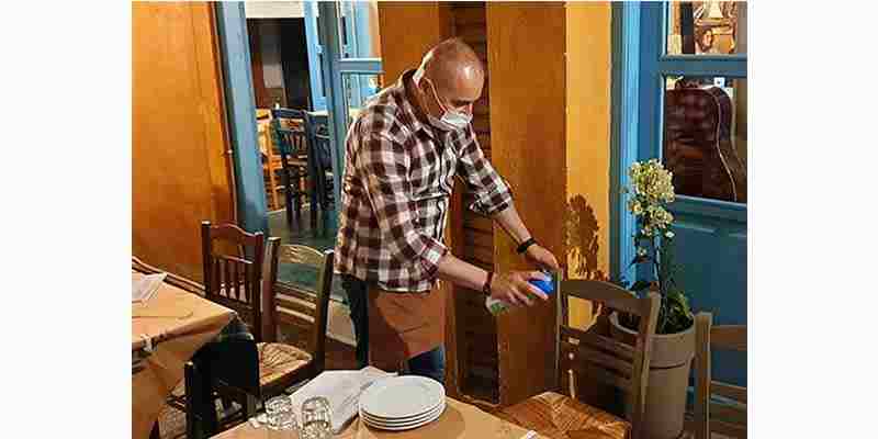 Όπως φαίνεται στο επόμενο βίντεο, ψεκάζει τραπέζια και καρέκλες με ειδικό καθαριστικό υγρό, πριν καθίσει κάθε πελάτης…
