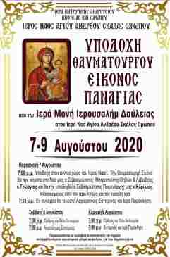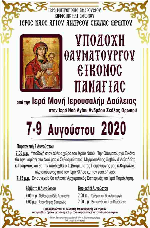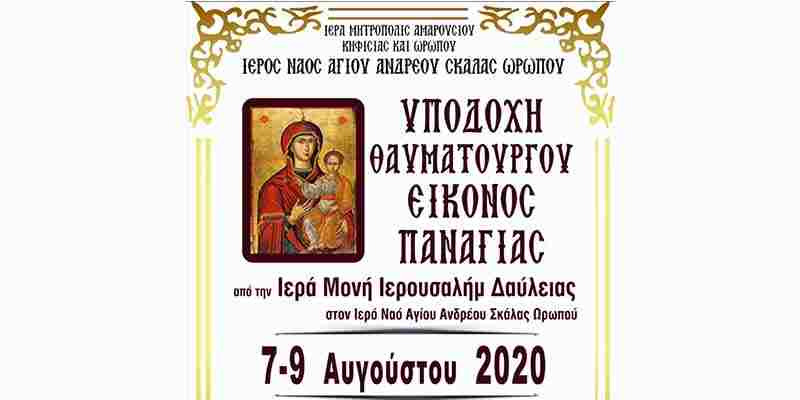 Η Ενορία του Αγίου Ανδρέου Σκάλας Ωρωπού υποδέχεται από 7 έως 9 Αυγούστου 2020 την Ιερά & Θαυματουργό Εικόνα της Υπεραγίας Θεοτόκου από την Ιερά Μονή Ιερουσαλήμ Δαύλειας Βοιωτίας. Ένα θρησκευτικό γεγονός ευλογίας των πιστών.