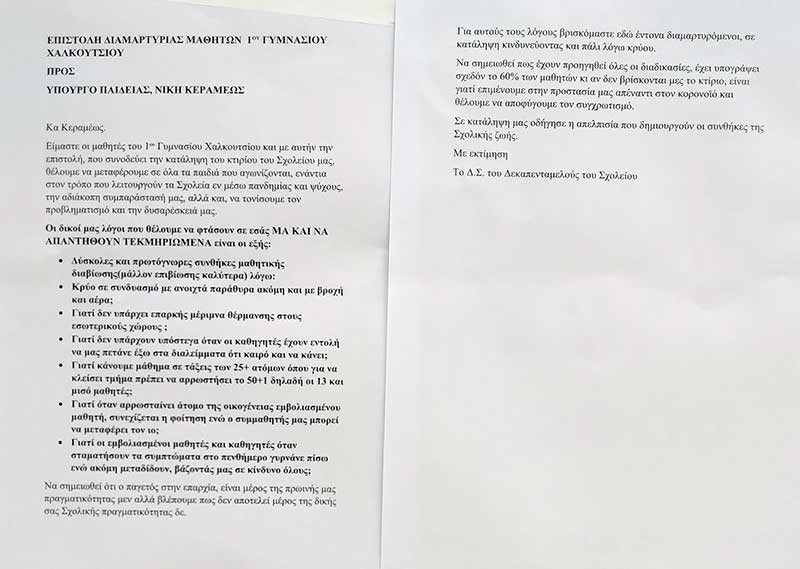 Είμαστε οι μαθητές του 1ου Γυμνασίου Χαλκουτσίου και με αυτήν την επιστολή, που συνοδεύει την κατάληψη του κτιρίου του Σχολείου μας, θέλουμε να μεταφέρουμε σε όλα τα παιδιά που αγωνίζονται, ενάντια στον τρόπο που λειτουργούν τα Σχολεία εν μέσω πανδημίας και ψύχους, την αδιάκοπη συμπαράστασή μας, αλλά και, να τονίσουμε τον προβληματισμό και την δυσαρέσκειά μας.