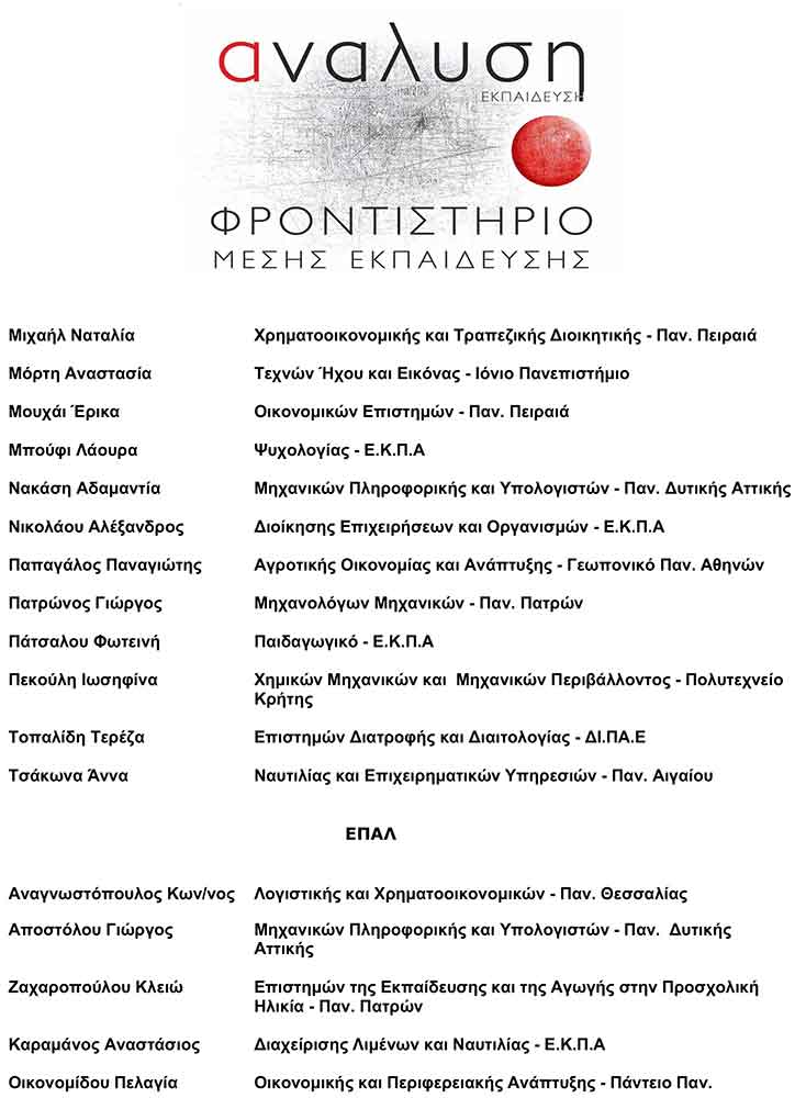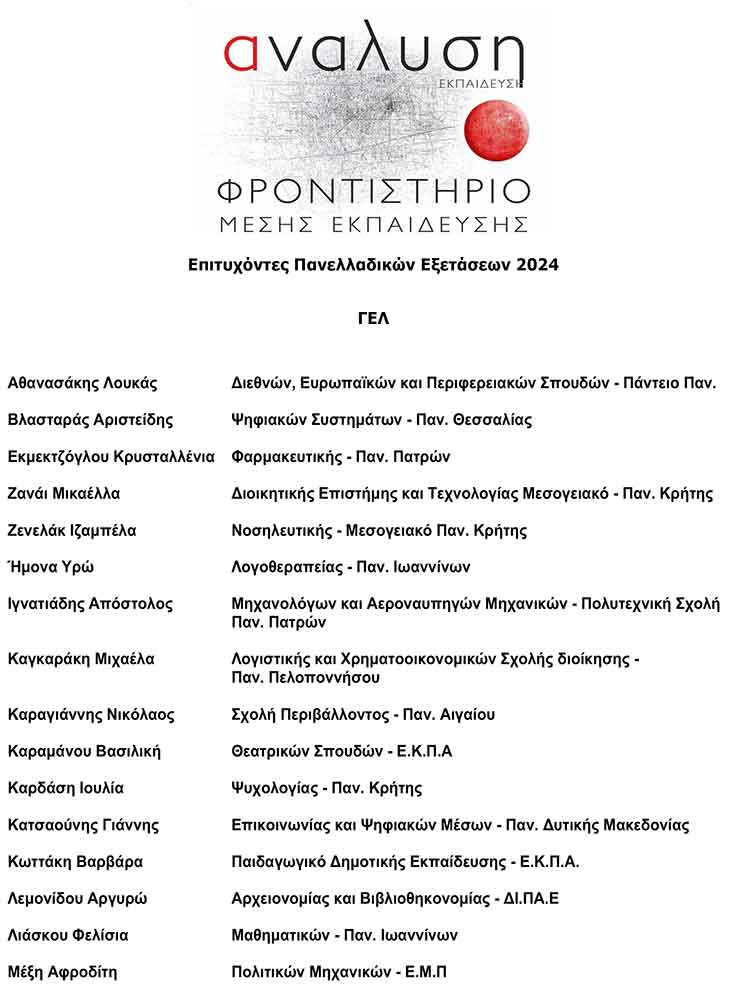 ΦΡΟΝΤΙΣΤΗΡΙΟ ΑΝΑΛΥΣΗ: Επιτυχόντες Πανελλαδικών Εξετάσεων 2024