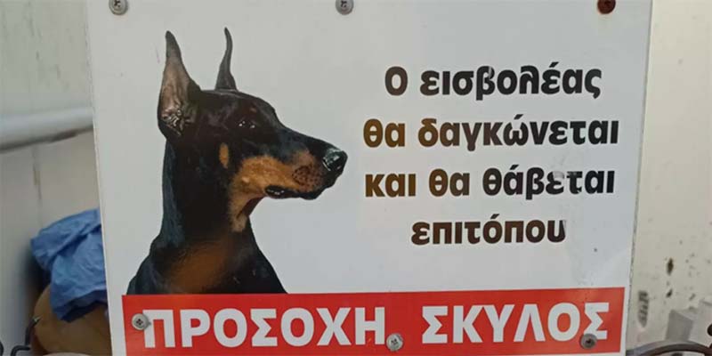 Χιούμορ, απειλή ή προειδοποίηση; Κανείς δεν μπορεί να πει με ασφάλεια απλά καλό είναι σε δημόσιες επιγραφές να κρατάμε τους τύπους. Εξάλλου για έναν σκύλο πρόκειται… ας μην υπερβάλλουμε.