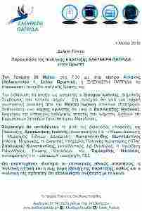 PREVIOUS Previous post: 30 Μαΐου 2018: Παρουσίαση της πολιτικής παράταξης ΕΛΕΥΘΕΡΗ ΠΑΤΡΙΔΑ στον Ωρωπό