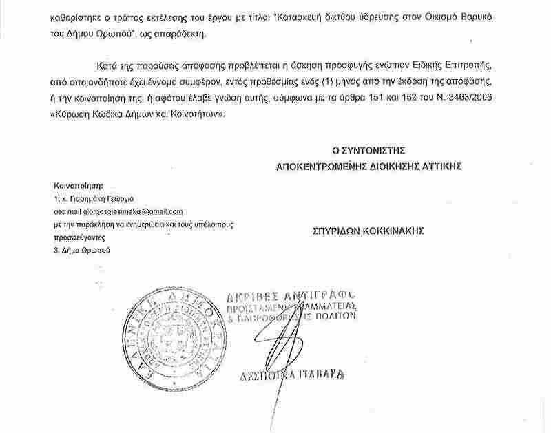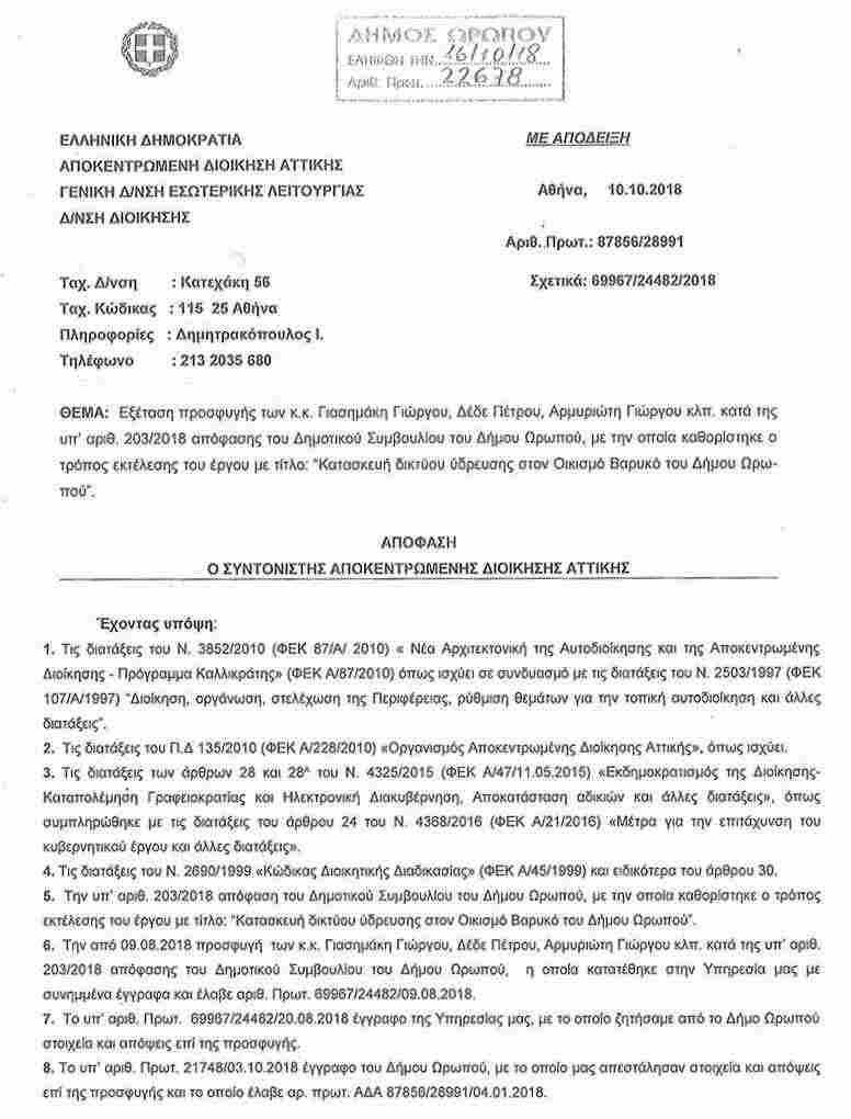 Απόρριψη προσφυγής των κ..Γιασημάκη Γιώργου, Χατζηιωάννου Άγγελου, Δέδε Πέτρου, Αρμυριώτη Γιώργου, Ράπτη Σπύρου, Παπαγιάννη Γεωργίου, και της παράταξης ”Δυναμική Πολιτεία”, από τον Συντονιστή της Αποκεντρωμένης Διοίκησης Αττικής, για το θέμα ”Κατασκευή δικτύου ύδρευσης στον Οικισμό Βαρυκό του Δήμου Ωρωπού.
