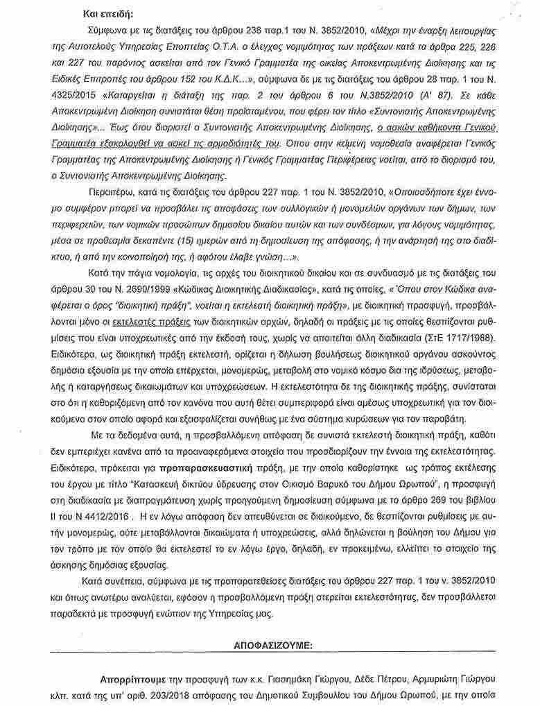 Οι λόγοι περί ακυρώσεως της απόφασης 203/2018 του Δημοτικού Συμβουλίου του Δήμου Ωρωπού, οι οποίοι προβλήθηκαν από τους προσφεύγοντες αλλά και οι εμπεριστατωμένες απόψεις του Δήμου εξετάστηκαν ενδελεχώς από την κρίνουσα Αρχή, με αποτέλεσμα η προσφυγή των Δημοτικών Συμβούλων της παράταξης ”Δυναμική Πολιτεία”, να απορριφθεί ως ΑΠΑΡΑΔΕΚΤΗ.