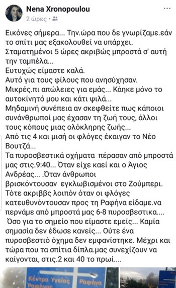 Τα πυροσβεστικά οχήματα πέρασαν από μπροστά μου στις 9:40. Όταν είχε καεί και ο Άγιος Ανδρέας. Όταν άνθρωποι βρισκόντουσαν εγκλωβισμένοι στο Ζούμπερι. Τότε λοιπόν, όταν οι φλόγες κατευθυνόντουσαν προς τη Ραφήνα, είδαμε να περνάν από μπροστά μας 6-8 πυροσβεστικά. Όσο για το σημείο που είμαστε εμείς… Καμία σημασία δεν έδωσε κανείς. Ούτε ένα πυροσβεστικό όχημα δεν εμφανίστηκε. Μέχρι και τώρα που τα σπίτια δίπλα μας συνεχίζουν να καίγονται. Στις 2 και 40 το πρωί».