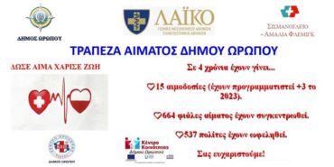 Ο ΔΗΜΟΣ ΩΡΩΠΟΥ ΤΙΜΑ ΤΗΝ ΠΑΓΚΟΣΜΙΑ ΗΜΕΡΑ ΕΘΕΛΟΝΤΗ ΑΙΜΟΔΟΤΗ: 664 ΦΙΑΛΕΣ ΑΙΜΑΤΟΣ ΣΕ 15 ΑΙΜΟΔΟΣΙΕΣ ΣΕ 4 ΧΡΟΝΙΑ ΚΑΙ ΣΥΝΕΧΙΖΟΥΜΕ… Ο Δήμος Ωρωπού τιμά την Παγκόσμια Ημέρα Εθελοντή Αιμοδότη – κάθε χρόνο 14 Ιουνίου 2023 – και κάνει απολογισμό του σπουδαίου έργου…