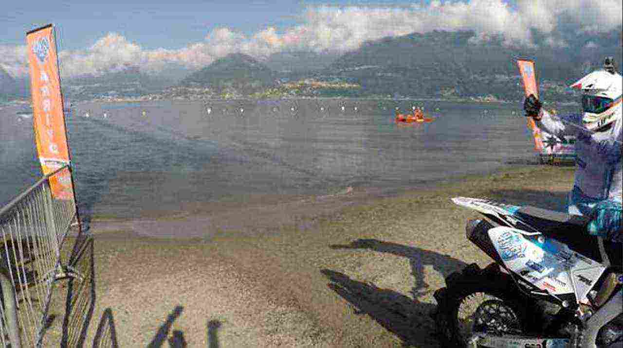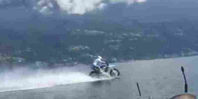 Αυτή είναι η συγκλονιστική στιγμή που ένας τολμηρός μοτοσικλετιστής οδήγησε την μηχανή του στην τρίτη μεγαλύτερη λίμνη της Ιταλίας.