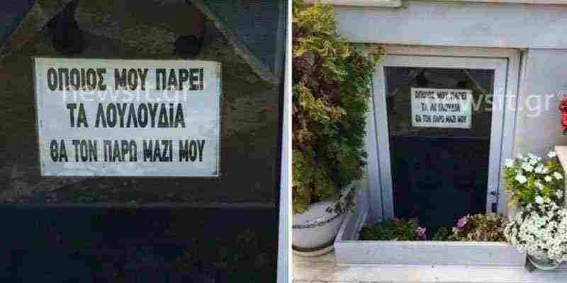 Προφανώς οι συγγενείς του μακαρίτη «καμμένοι» από τις συνεχείς κλοπές – που συνηθίζονται στα νεκροταφεία – αποφάσισαν να πάρουν την κατάσταση στα χέρια τους. Έτσι, έβαλαν αυτή την επιγραφή που φαίνεται σα να προέρχεται από τον ίδιο τον «ένοικο» του τάφου. «Όποιος μου πάρει τα λουλούδια θα τον πάρω μαζί μου».